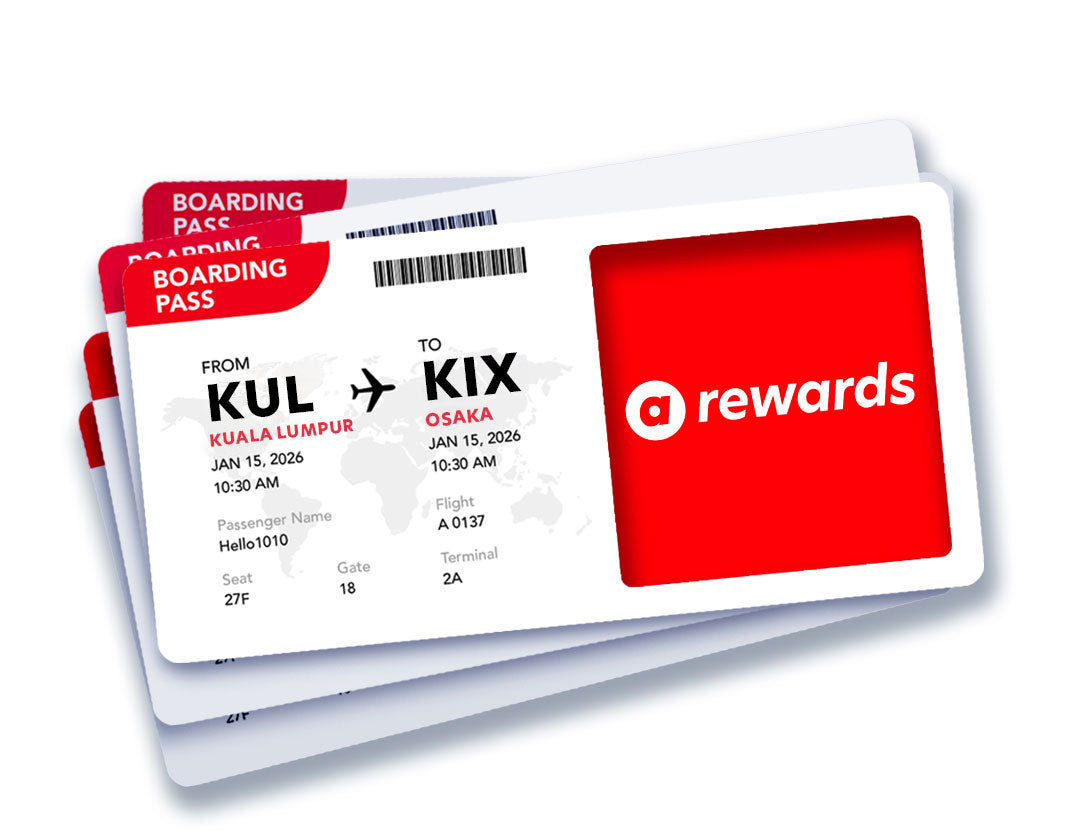 - The prize consists of two (2) return economy class flights operated by AirAsia X (D7) from Kuala Lumpur to Osaka, Japan, inclusive of 20kg checked baggage per passenger with all applicable taxes, fees, and surcharges included.
